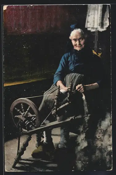 AK Ältere Frau in blauer Bluse am Spinnrad