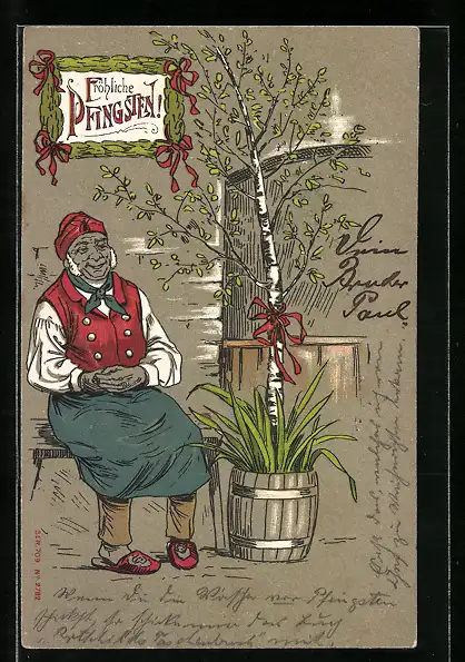 AK Älterer Herr sitzt zu Pfingsten an einem kleinen Birkenbaum