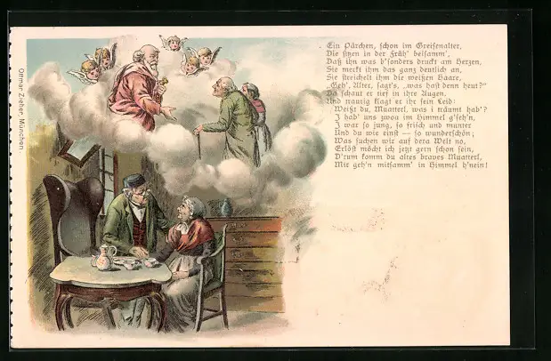 AK Älteres Paar am Tisch und Bei Gott mit Englein