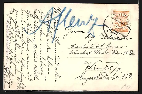 Personenbezogene Daten auf der Rückseite der Karte wurden durch blauen Textmarker unkenntlich gemacht. Die blauen Stellen sind auf die Vorderseite durchgeweicht und wirken sich negativ auf das Postkartenfoto aus