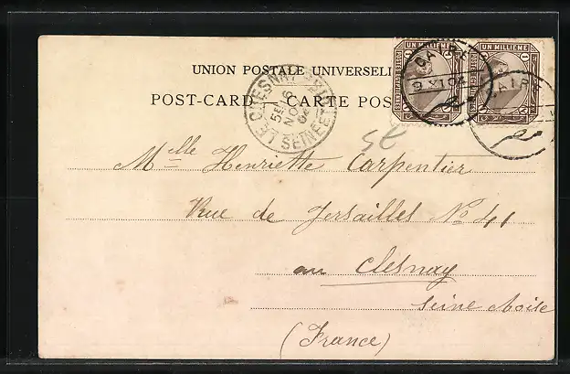 Personenbezogene Daten auf der Rückseite der Karte wurden durch blauen Textmarker unkenntlich gemacht. Die blauen Stellen sind auf die Vorderseite durchgeweicht und wirken sich negativ auf das Postkartenfoto aus
