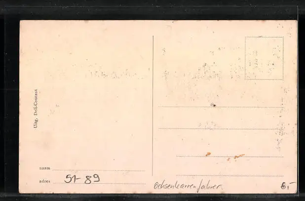 Personenbezogene Daten auf der Rückseite der Karte wurden durch blauen Textmarker unkenntlich gemacht. Die blauen Stellen sind auf die Vorderseite durchgeweicht und wirken sich negativ auf das Postkartenfoto aus