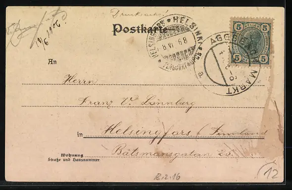 Personenbezogene Daten auf der Rückseite der Karte wurden durch blauen Textmarker unkenntlich gemacht. Die blauen Stellen sind auf die Vorderseite durchgeweicht und wirken sich negativ auf das Postkartenfoto aus