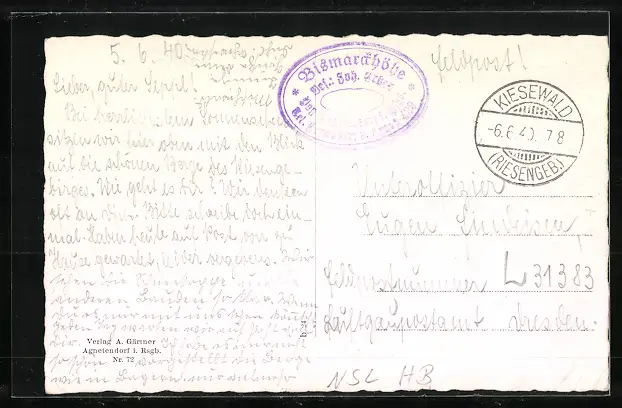 alte Ansichtskarte, gelaufen 1940, Eckknicke unten, Bugspur unten li., guter Zustand