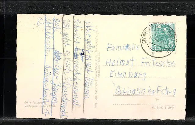 Personenbezogene Daten auf der Rückseite der Karte wurden durch blauen Textmarker unkenntlich gemacht. Die blauen Stellen sind auf die Vorderseite durchgeweicht und wirken sich negativ auf das Postkartenfoto aus