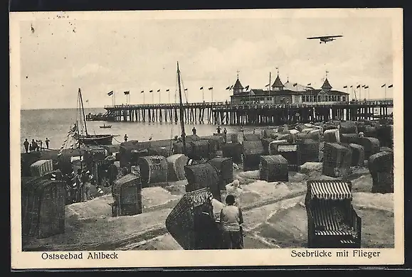 AK Ahlbeck /Ostsee, Seebrücke mit Flugzeug
