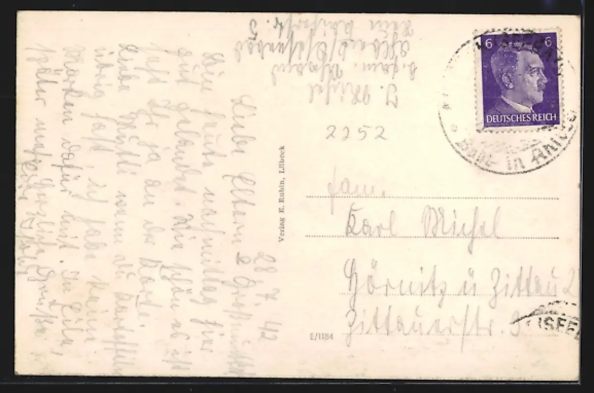 Personenbezogene Daten auf der Rückseite der Karte wurden durch blauen Textmarker unkenntlich gemacht. Die blauen Stellen sind auf die Vorderseite durchgeweicht und wirken sich negativ auf das Postkartenfoto aus
