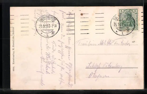 Personenbezogene Daten auf der Rückseite der Karte wurden durch blauen Textmarker unkenntlich gemacht. Die blauen Stellen sind auf die Vorderseite durchgeweicht und wirken sich negativ auf das Postkartenfoto aus
