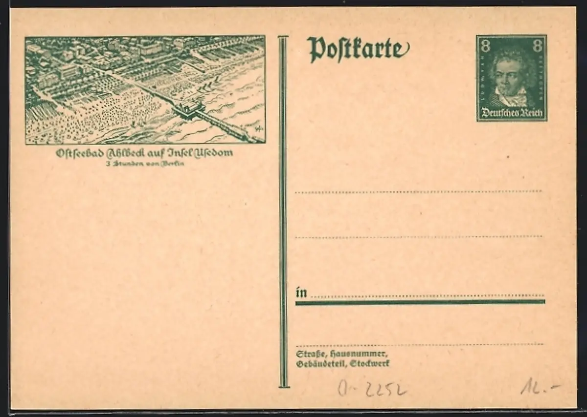 AK Ahlbeck, Strandblick mit Seebrücke, Ganzsache