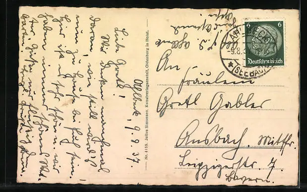 gelaufen 1937, Eckknick unte li., guter Zustand