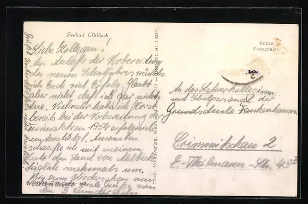 Personenbezogene Daten auf der Rückseite der Karte wurden durch blauen Textmarker unkenntlich gemacht. Die blauen Stellen sind auf die Vorderseite durchgeweicht und wirken sich negativ auf das Postkartenfoto aus