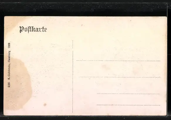 Personenbezogene Daten auf der Rückseite der Karte wurden durch blauen Textmarker unkenntlich gemacht. Die blauen Stellen sind auf die Vorderseite durchgeweicht und wirken sich negativ auf das Postkartenfoto aus
