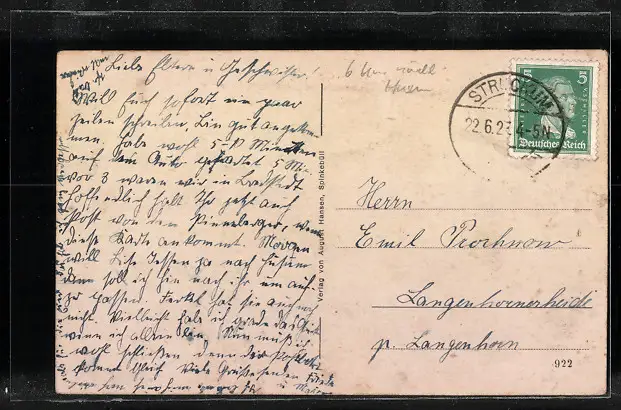 Personenbezogene Daten auf der Rückseite der Karte wurden durch blauen Textmarker unkenntlich gemacht. Die blauen Stellen sind auf die Vorderseite durchgeweicht und wirken sich negativ auf das Postkartenfoto aus