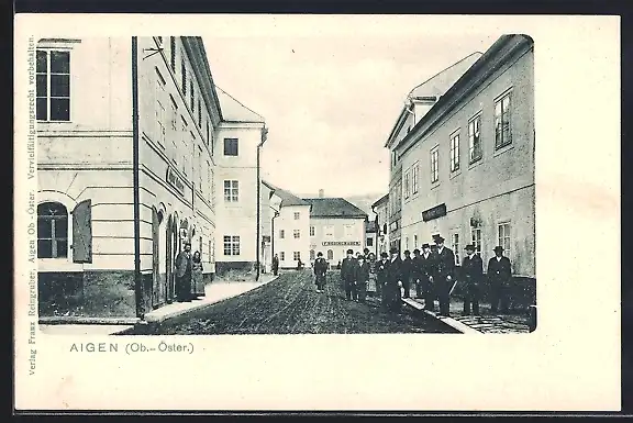 AK Aigen /Ob.-Öster., Strassenpartie mit Geschäftshäusern und Versammlung