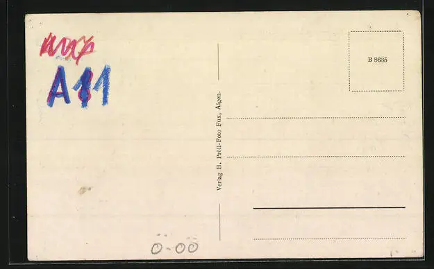 Personenbezogene Daten auf der Rückseite der Karte wurden durch blauen Textmarker unkenntlich gemacht. Die blauen Stellen sind auf die Vorderseite durchgeweicht und wirken sich negativ auf das Postkartenfoto aus