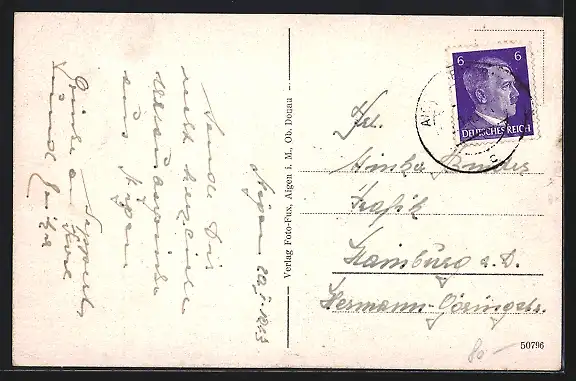 Personenbezogene Daten auf der Rückseite der Karte wurden durch blauen Textmarker unkenntlich gemacht. Die blauen Stellen sind auf die Vorderseite durchgeweicht und wirken sich negativ auf das Postkartenfoto aus