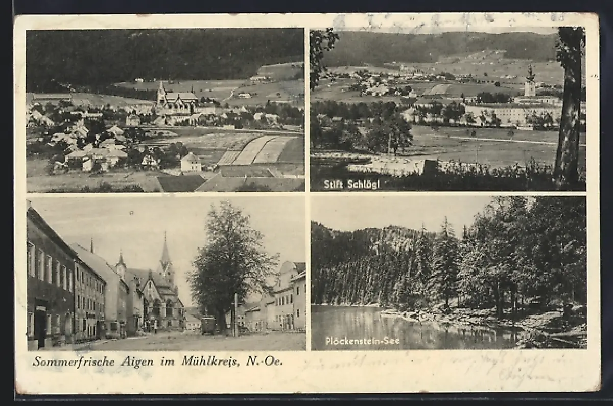AK Aigen im Mühlkreis, Totalansicht, Plöckenstein-See, Stift Schlägl, Strassenpartie