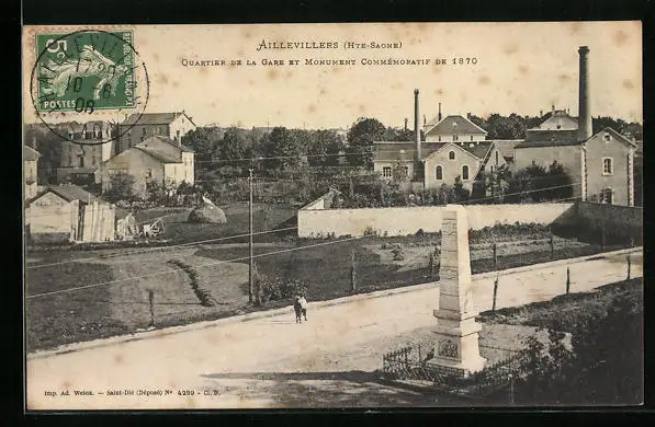 AK Aillevillers, Quartier de la Gare et Monument Commémoratif de 1870