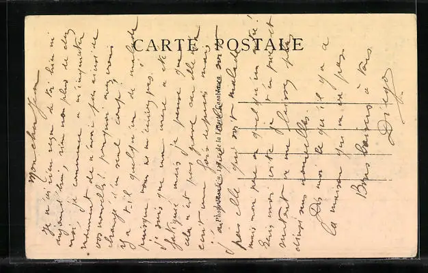 Personenbezogene Daten auf der Rückseite der Karte wurden durch blauen Textmarker unkenntlich gemacht. Die blauen Stellen sind auf die Vorderseite durchgeweicht und wirken sich negativ auf das Postkartenfoto aus