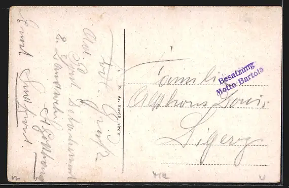 Personenbezogene Daten auf der Rückseite der Karte wurden durch blauen Textmarker unkenntlich gemacht. Die blauen Stellen sind auf die Vorderseite durchgeweicht und wirken sich negativ auf das Postkartenfoto aus