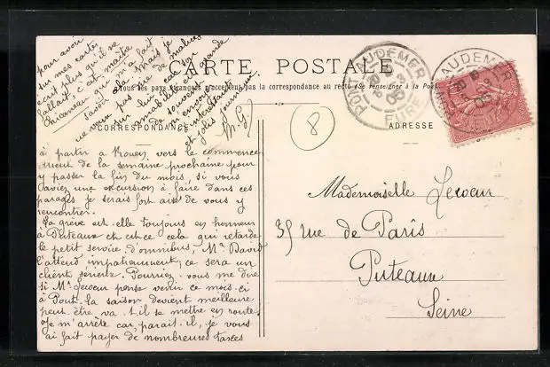 Personenbezogene Daten auf der Rückseite der Karte wurden durch blauen Textmarker unkenntlich gemacht. Die blauen Stellen sind auf die Vorderseite durchgeweicht und wirken sich negativ auf das Postkartenfoto aus