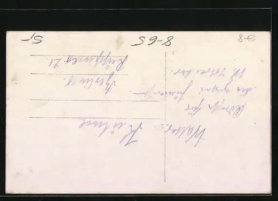 Personenbezogene Daten auf der Rückseite der Karte wurden durch blauen Textmarker unkenntlich gemacht. Die blauen Stellen sind auf die Vorderseite durchgeweicht und wirken sich negativ auf das Postkartenfoto aus