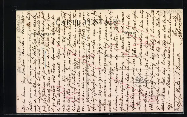 Personenbezogene Daten auf der Rückseite der Karte wurden durch blauen Textmarker unkenntlich gemacht. Die blauen Stellen sind auf die Vorderseite durchgeweicht und wirken sich negativ auf das Postkartenfoto aus