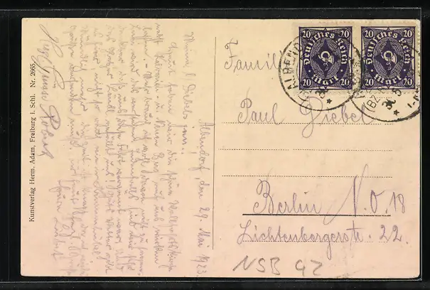 gelaufen 1923, Eckknick rechts oben, guter Zustand
