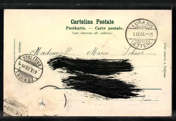 Personenbezogene Daten auf der Rückseite der Karte wurden durch blauen Textmarker unkenntlich gemacht. Die blauen Stellen sind auf die Vorderseite durchgeweicht und wirken sich negativ auf das Postkartenfoto aus