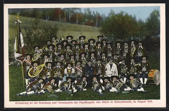 AK Aldein, Fahnenweihe der Musikkapelle in Nationaltracht mit Instrumenten 1914