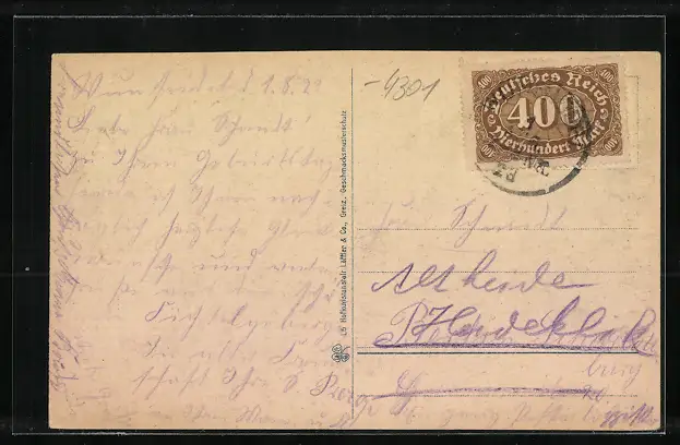 Personenbezogene Daten auf der Rückseite der Karte wurden durch blauen Textmarker unkenntlich gemacht. Die blauen Stellen sind auf die Vorderseite durchgeweicht und wirken sich negativ auf das Postkartenfoto aus