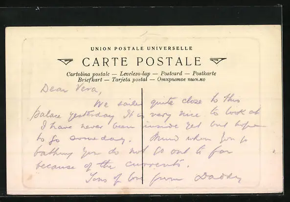 Personenbezogene Daten auf der Rückseite der Karte wurden durch blauen Textmarker unkenntlich gemacht. Die blauen Stellen sind auf die Vorderseite durchgeweicht und wirken sich negativ auf das Postkartenfoto aus