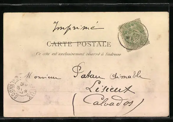Personenbezogene Daten auf der Rückseite der Karte wurden durch blauen Textmarker unkenntlich gemacht. Die blauen Stellen sind auf die Vorderseite durchgeweicht und wirken sich negativ auf das Postkartenfoto aus