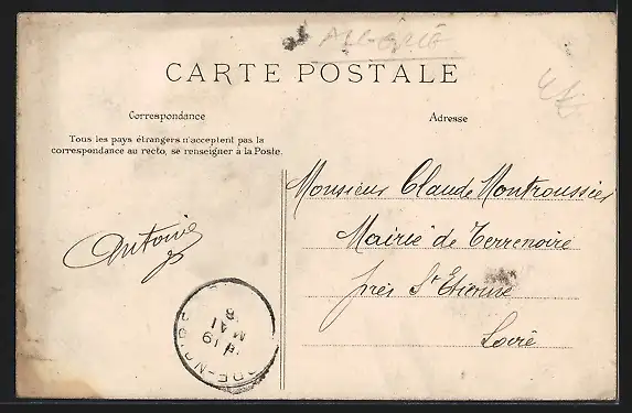 Personenbezogene Daten auf der Rückseite der Karte wurden durch blauen Textmarker unkenntlich gemacht. Die blauen Stellen sind auf die Vorderseite durchgeweicht und wirken sich negativ auf das Postkartenfoto aus