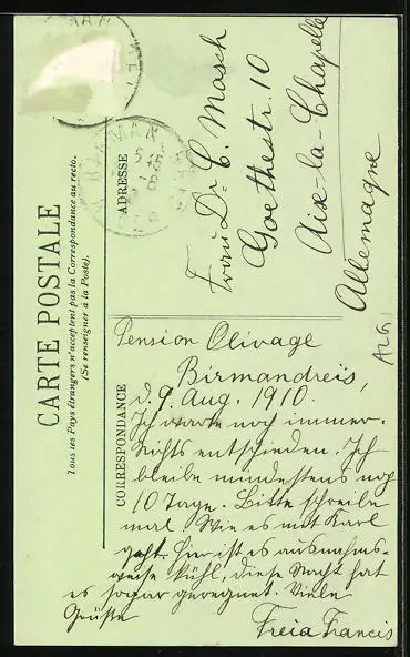 Personenbezogene Daten auf der Rückseite der Karte wurden durch blauen Textmarker unkenntlich gemacht. Die blauen Stellen sind auf die Vorderseite durchgeweicht und wirken sich negativ auf das Postkartenfoto aus