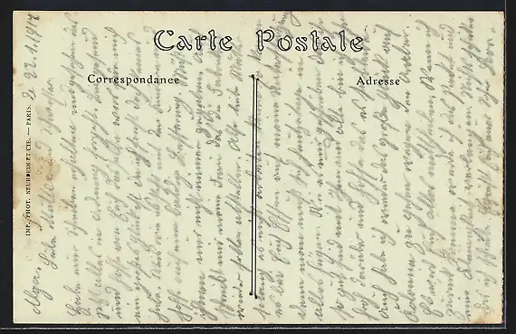 Personenbezogene Daten auf der Rückseite der Karte wurden durch blauen Textmarker unkenntlich gemacht. Die blauen Stellen sind auf die Vorderseite durchgeweicht und wirken sich negativ auf das Postkartenfoto aus