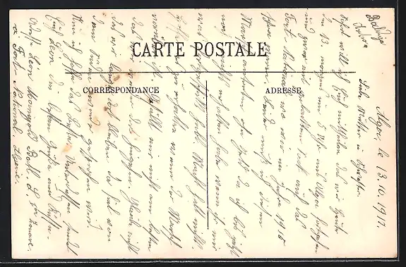 Personenbezogene Daten auf der Rückseite der Karte wurden durch blauen Textmarker unkenntlich gemacht. Die blauen Stellen sind auf die Vorderseite durchgeweicht und wirken sich negativ auf das Postkartenfoto aus