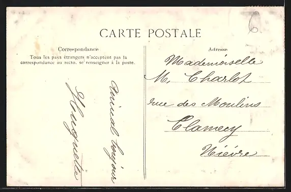 Personenbezogene Daten auf der Rückseite der Karte wurden durch blauen Textmarker unkenntlich gemacht. Die blauen Stellen sind auf die Vorderseite durchgeweicht und wirken sich negativ auf das Postkartenfoto aus