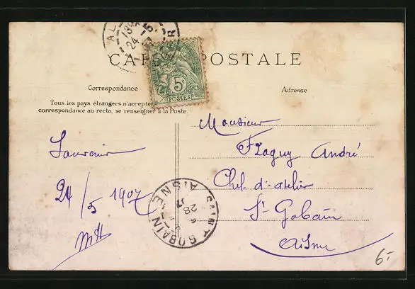 Personenbezogene Daten auf der Rückseite der Karte wurden durch blauen Textmarker unkenntlich gemacht. Die blauen Stellen sind auf die Vorderseite durchgeweicht und wirken sich negativ auf das Postkartenfoto aus