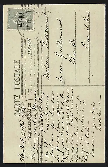 Personenbezogene Daten auf der Rückseite der Karte wurden durch blauen Textmarker unkenntlich gemacht. Die blauen Stellen sind auf die Vorderseite durchgeweicht und wirken sich negativ auf das Postkartenfoto aus