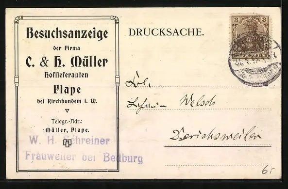 Personenbezogene Daten auf der Rückseite der Karte wurden durch blauen Textmarker unkenntlich gemacht. Die blauen Stellen sind auf die Vorderseite durchgeweicht und wirken sich negativ auf das Postkartenfoto aus