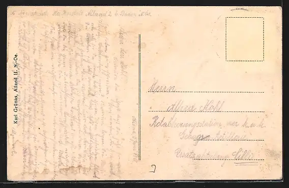 Personenbezogene Daten auf der Rückseite der Karte wurden durch blauen Textmarker unkenntlich gemacht. Die blauen Stellen sind auf die Vorderseite durchgeweicht und wirken sich negativ auf das Postkartenfoto aus