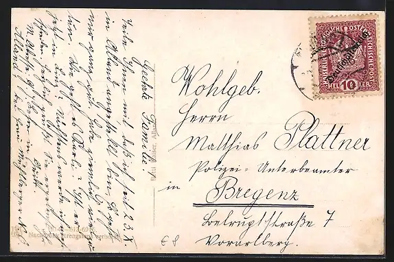 Personenbezogene Daten auf der Rückseite der Karte wurden durch blauen Textmarker unkenntlich gemacht. Die blauen Stellen sind auf die Vorderseite durchgeweicht und wirken sich negativ auf das Postkartenfoto aus