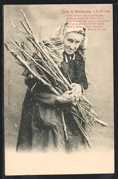 AK Allegorie zum Winter, Alte Frau sammelt Feuerholz