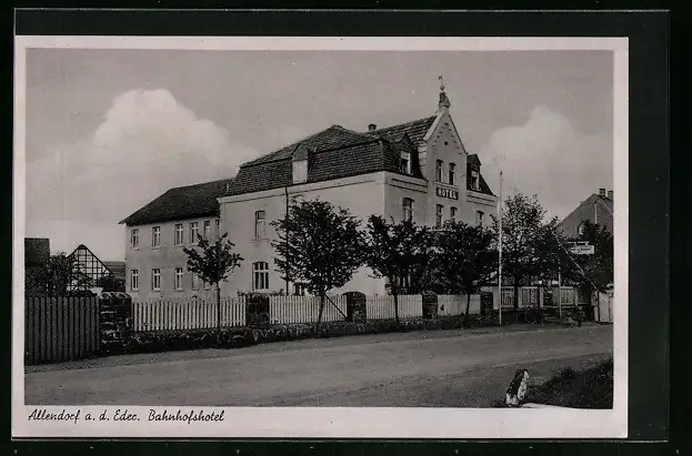 AK Allendorf a. d. Eder, Bahnhofshotel mit unbefestigter Strasse