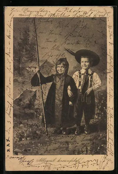 AK Alleweil kreuzfidel!, Münchner Kindl und Junge in Tracht