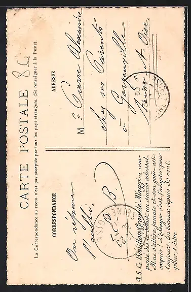 Personenbezogene Daten auf der Rückseite der Karte wurden durch blauen Textmarker unkenntlich gemacht. Die blauen Stellen sind auf die Vorderseite durchgeweicht und wirken sich negativ auf das Postkartenfoto aus