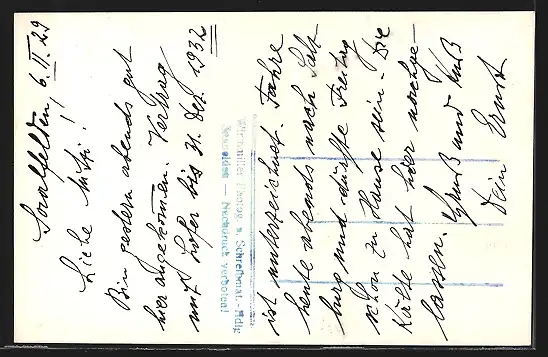 Personenbezogene Daten auf der Rückseite der Karte wurden durch blauen Textmarker unkenntlich gemacht. Die blauen Stellen sind auf die Vorderseite durchgeweicht und wirken sich negativ auf das Postkartenfoto aus