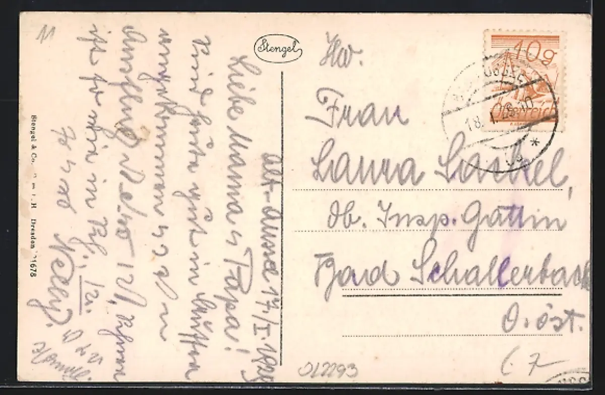 Personenbezogene Daten auf der Rückseite der Karte wurden durch blauen Textmarker unkenntlich gemacht. Die blauen Stellen sind auf die Vorderseite durchgeweicht und wirken sich negativ auf das Postkartenfoto aus