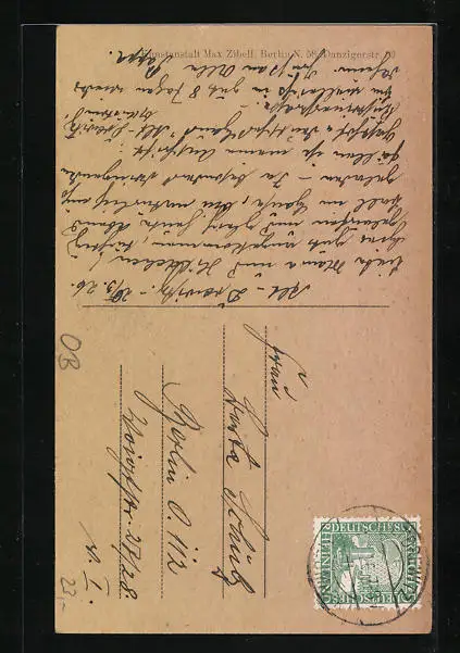 Personenbezogene Daten auf der Rückseite der Karte wurden durch blauen Textmarker unkenntlich gemacht. Die blauen Stellen sind auf die Vorderseite durchgeweicht und wirken sich negativ auf das Postkartenfoto aus